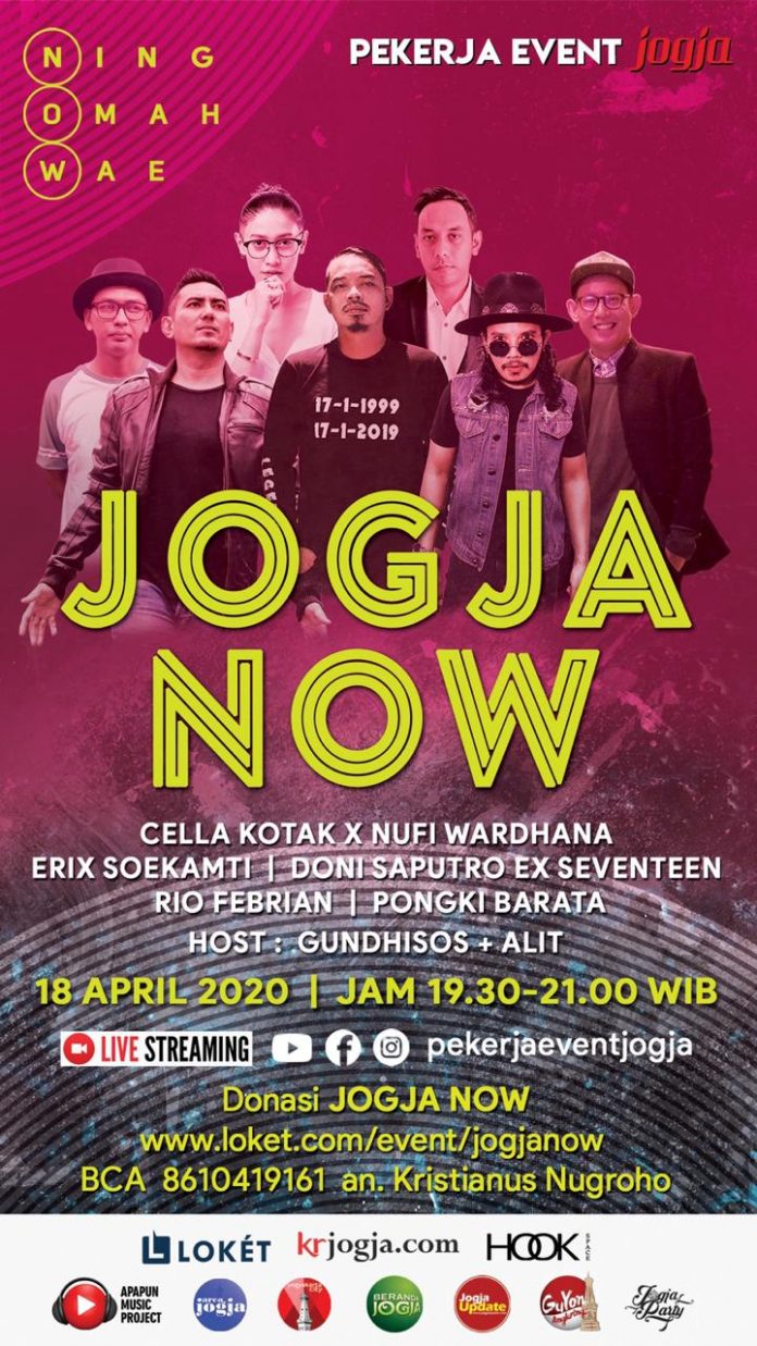 JOGJA NOW Live Streaming Concert akan diadakan pada hari Sabtu, 18 April 2020 pukul 15:00 - 21:00. Live Concert ini dapat disaksikan di channel youtube Pekerja Event Jogja, akun instagram @pekerjaeventjoggja , dan beberapa jaringan media sosial media lainya. Aksi ini bertujuan untuk menggalang dana yang akan disumbangkan kepada masyarakat Jogja yang terdampak Pandemi COVID-19 ini. Sejumlah musisi dan seniman sudah dikonfirmasi atas keterlibatannya di event ini, antara lain; Doni Saputro eks Seventeen, Rio Febrian, Cella Kotak, Pongki Bharata, Erix Soekamti, Nufi Wardhana, Alit Jabang Bayi, Gundhi, dan lain-lain. Untuk donasi Jogja NOW bisa dilakukan melalui http://www.loket.com/event/jogjanow atau transfer melalui rekening BCA 8610419161 a/n Kristianus Nugroho.
